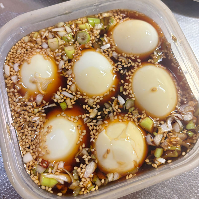 冷蔵庫が卵だらけになってしまったので1cmのお湯で半熟卵茹でて味付け卵仕込んだ。