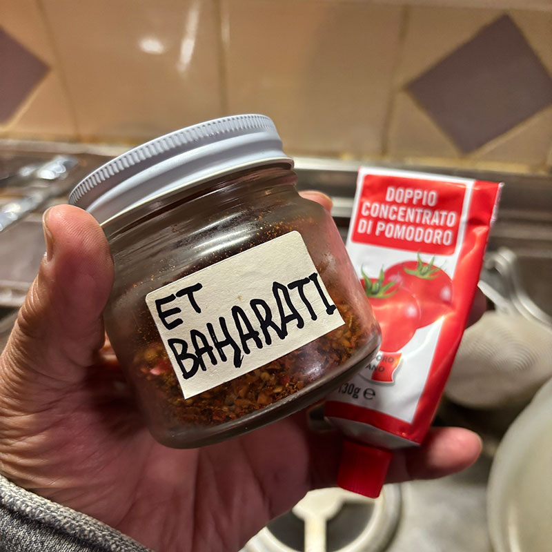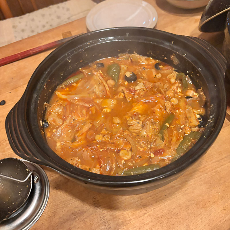 昨日、昆布と干し椎茸の出汁に塩麹で味付けした今季初の鍋。今日は残りにトマトピューレと姪っ子にもらったバハラットスパイスたくさん入れてトマト味に味変して鍋。