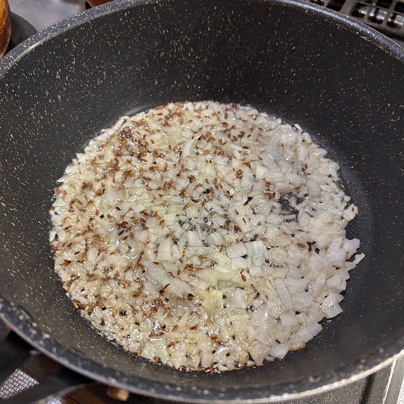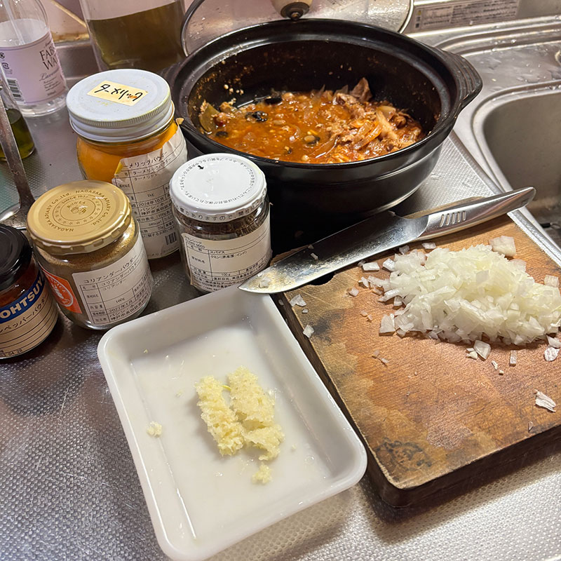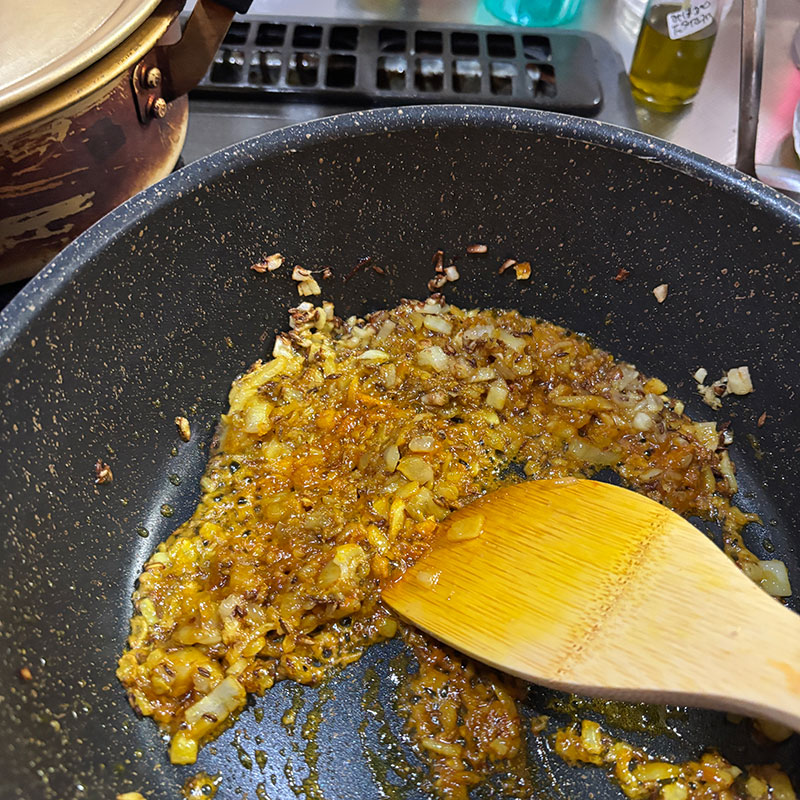 玉ねぎ、ニンニク、生姜炒めてターメリックとコリアンダー炒めて鍋の残りを投入。