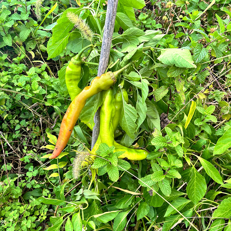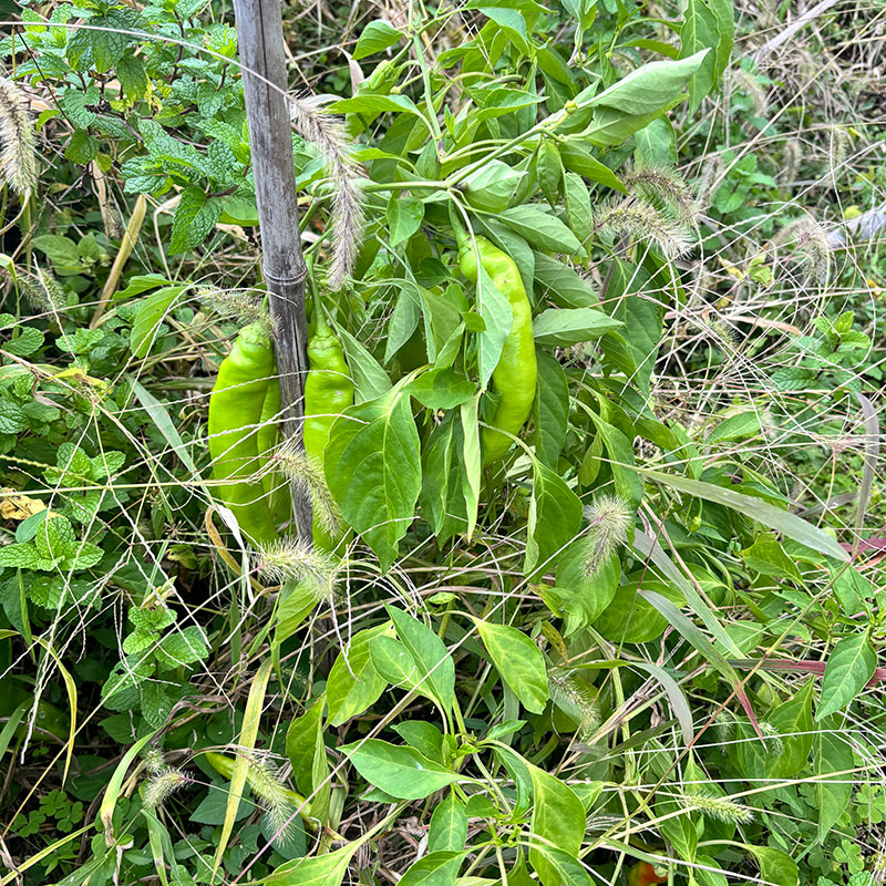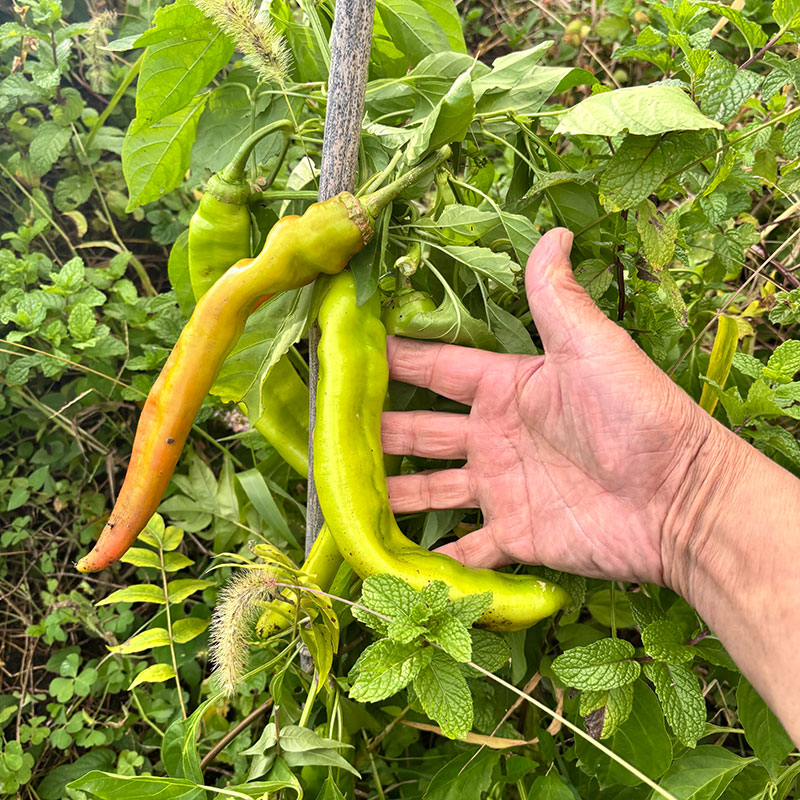 畑に福耳とうがらしがたくさん成ってる。見てこの大きさ!とうがらしだけど甘くて美味しい。
