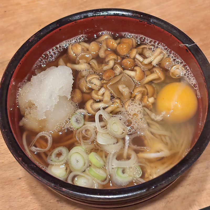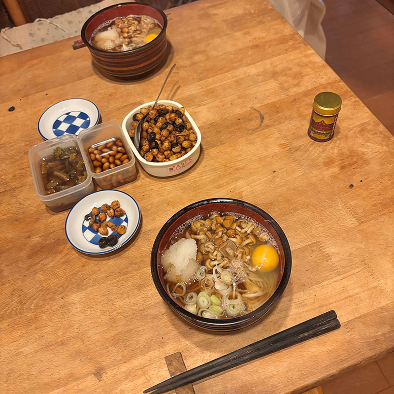 #月曜日は麺曜日 なめこおろし月見そばの夕食。たっぷりの鰹節と昆布で出汁をとって大根おろしの汁も絞ってつゆを作った。