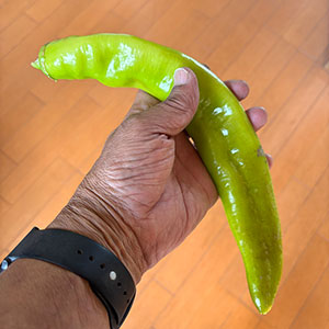 畑に福耳とうがらしがたくさん成ってる。見てこの大きさ!とうがらしだけど甘くて美味しい。