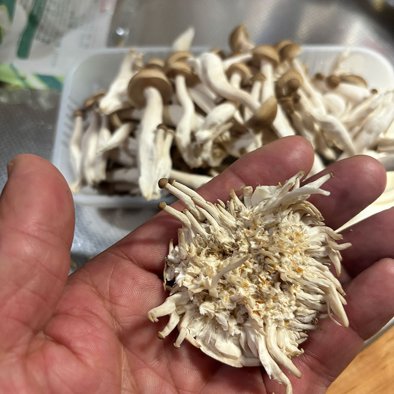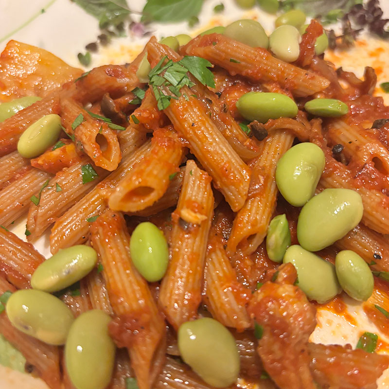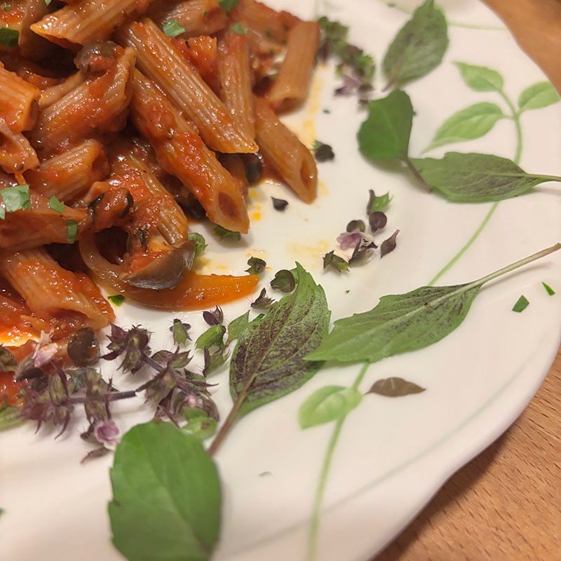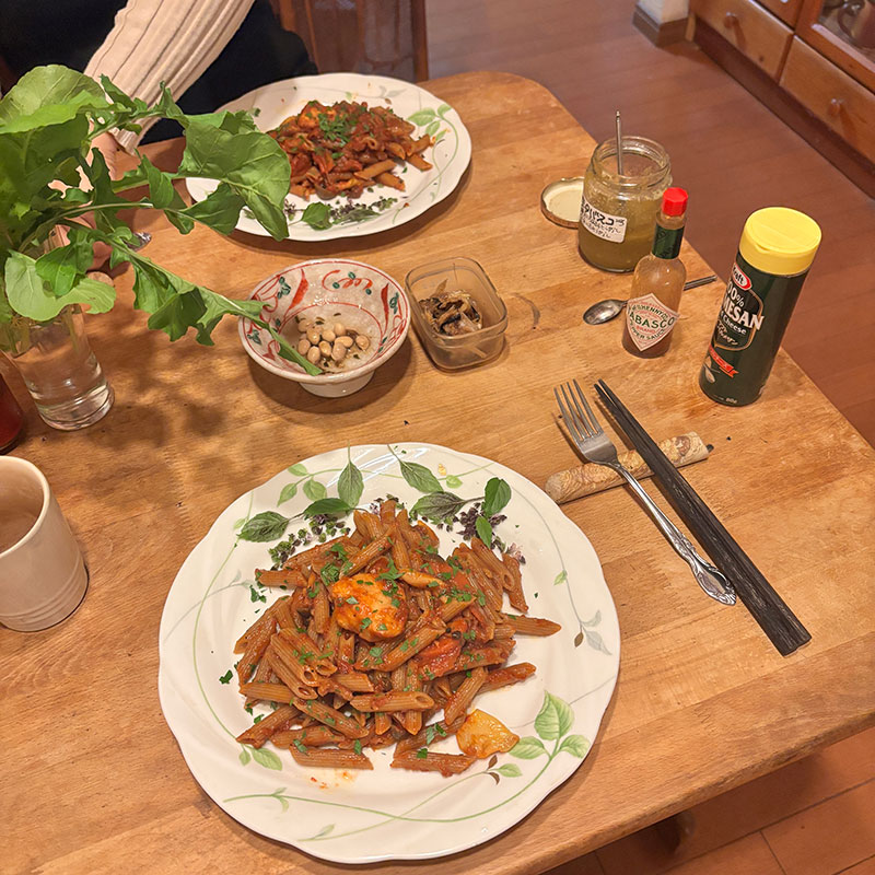 姪っ子にもらったペンネ 昨晩、姪っ子にもらったトマトピューレで使った鶏肉のトマト煮をベースに バターでこんがり焼き色つけたしめじやトマトピューレ足してトマトソース作ってパスタ。 買い置きのパスタ足りなかったけど、これも夏に姪っ子にもらっていたイタリアの有機栽培のデュラムセモリナの全粒粉ペンネリガーテがあった。 プランターのイタリアンパセリと 庭のホーリーバジルの葉と穂紫蘇トッピング。 なんとも良い香り。 自家製のタバスコが美味しい。 秘伝豆も追加でトッピング。 ルッコラ しめじの石づきはしめじを抜いて取る。 切ると食べられるところ捨ててもったいない。石づきだけきれいに丸く残る。 2025年10月16日 | コメントはまだありません | カテゴリー: 三日坊主日記