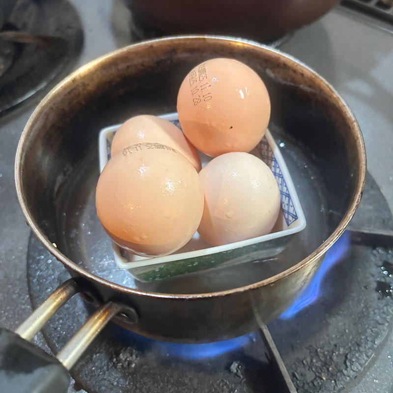ゆで卵は黄身が真ん中にくるように立てて水深1cmのお湯で茹でた。