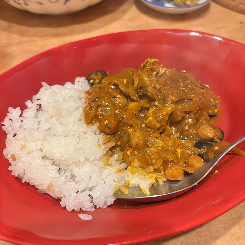 たくさん作りすぎて食べ切れなかった、ひよこ豆と黒オリーブのスペイン風炒めも残りたくさん全部入れた。スパイスカレーと豆は相性いいからね。ダルカレーという豆のカレーのジャンルがあるくらいで。