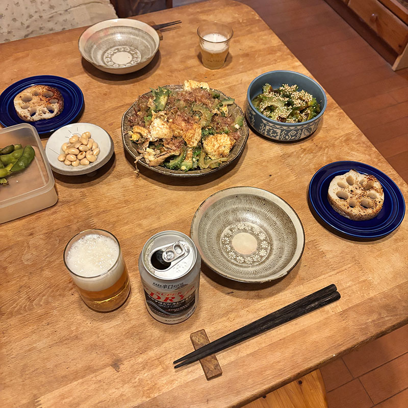 採りたてのゴーヤの歯応えの気持ち良い事。いつもの倍の値段の豆腐を使った。