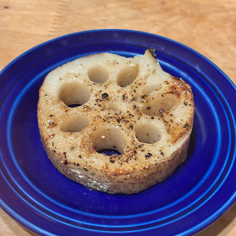 いただいた絶品レンコンのステーキ。今宵は3品とも歯応えのあるものばかりだ・笑