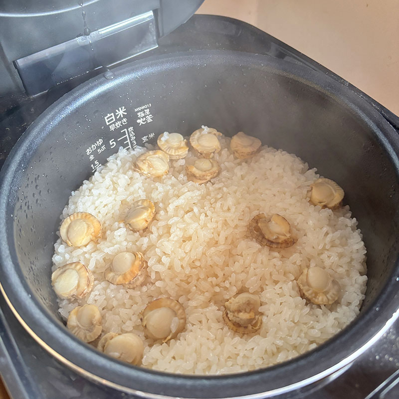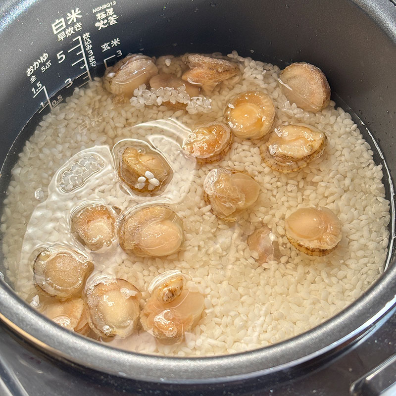 炊飯器にセットした米と水に小さいけど北海道の帆立とタレを入れて炊くだけ。