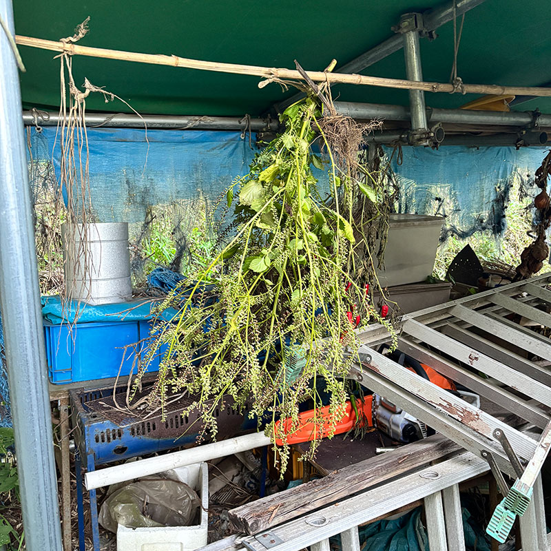 畑の大葉も倒した。自家採種出来るように陰干ししておく。