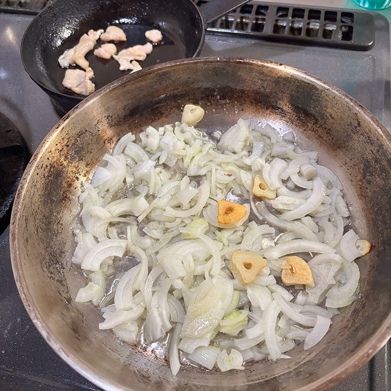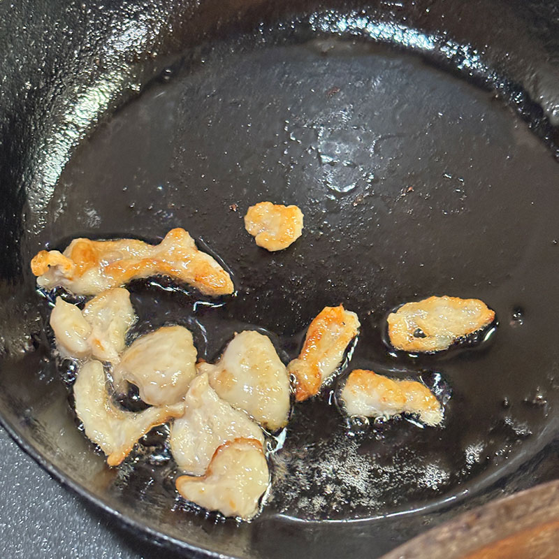 滲み出た鶏油とカリカリの鶏皮も加えた。