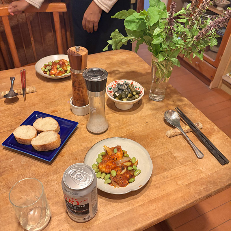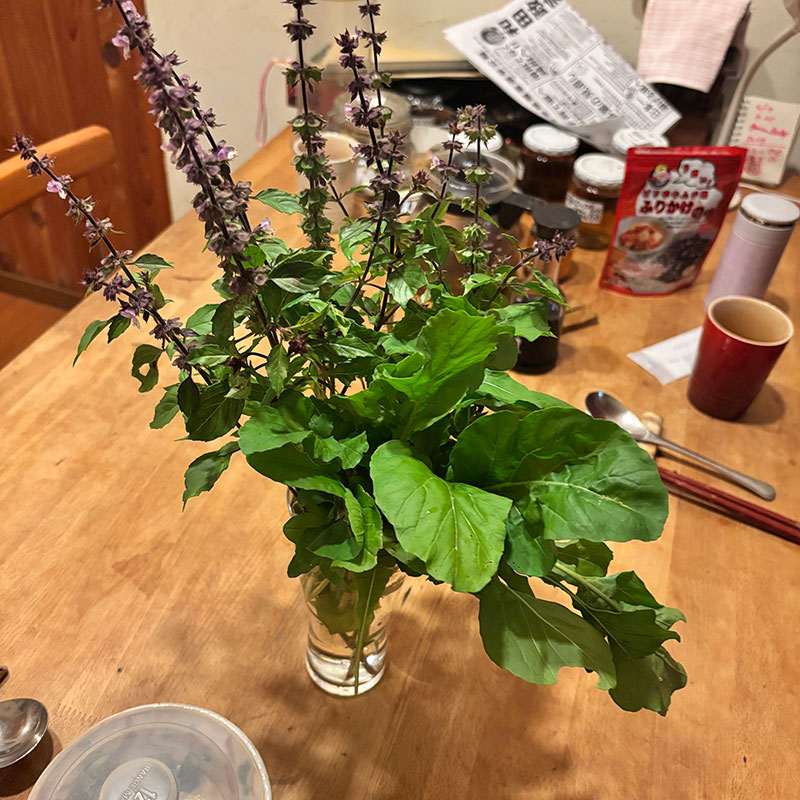 食べる時にもテーブルの葉を摘んで追いバジル。ルッコラも摘んでおいて包んで食べたり。