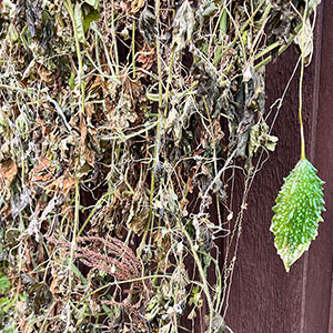 緑のカーテン枯れた 緑のカーテンにするために移植してから198日目のゴーヤ。 霜が降り出して 一気に枯れた。 小さな実を 最後に収穫してゴーヤのナムルにした。今年はたくさん収穫できたしこれにハマって作りまくった。それも最後だ。 小さな実は硬 […] もっと読む » 2025年11月21日 | コメントはまだありません | カテゴリー: 三日坊主日記