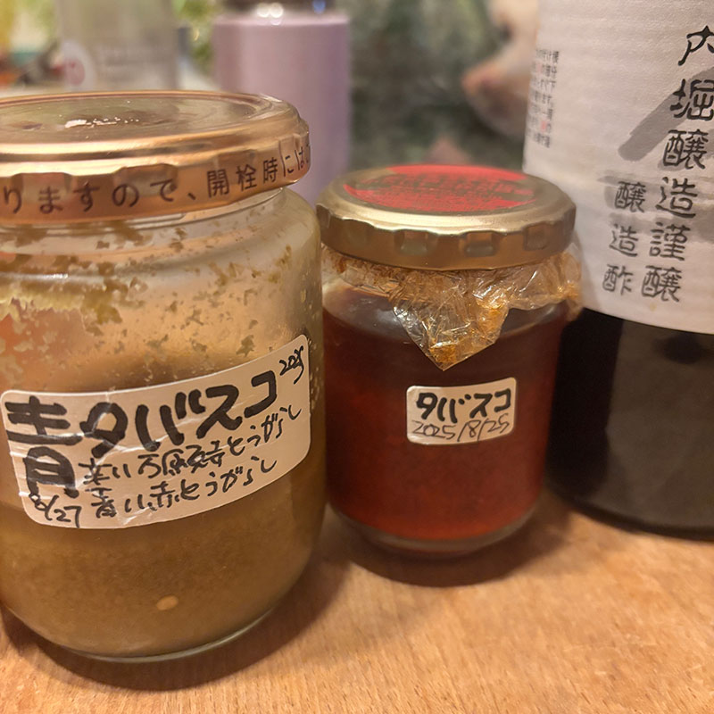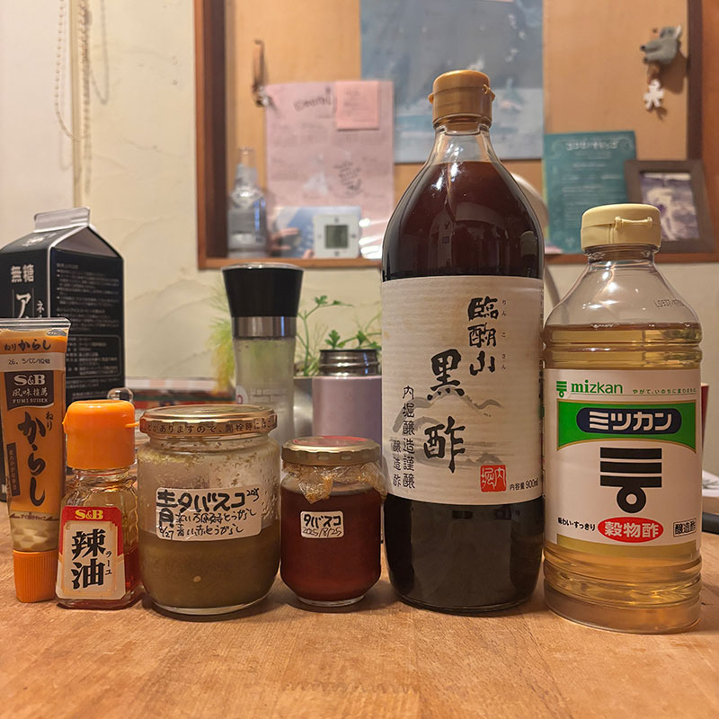 自家製のタバスコにつけて食べるのも美味しい。