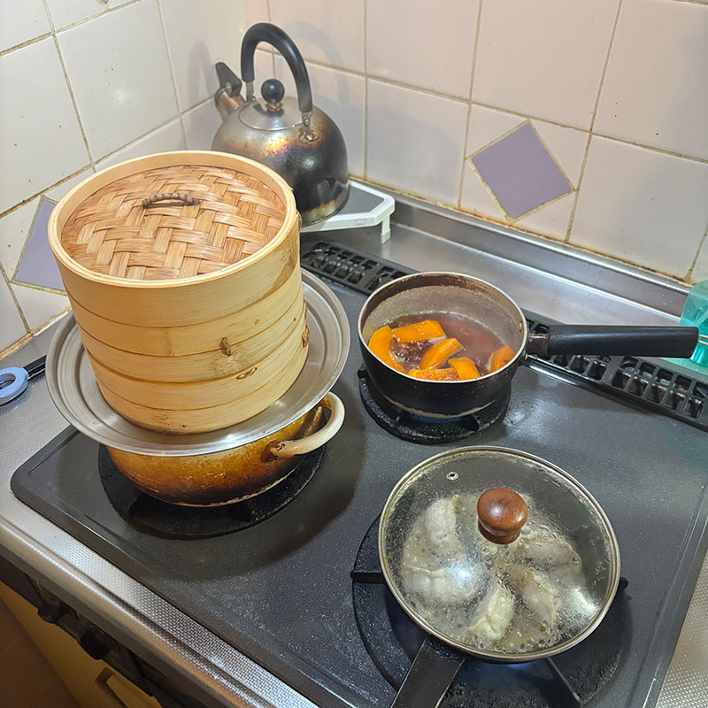 昨日いただいた551の豚まんの蒸籠蒸しとこれもいただいた浜松餃子焼いた。
