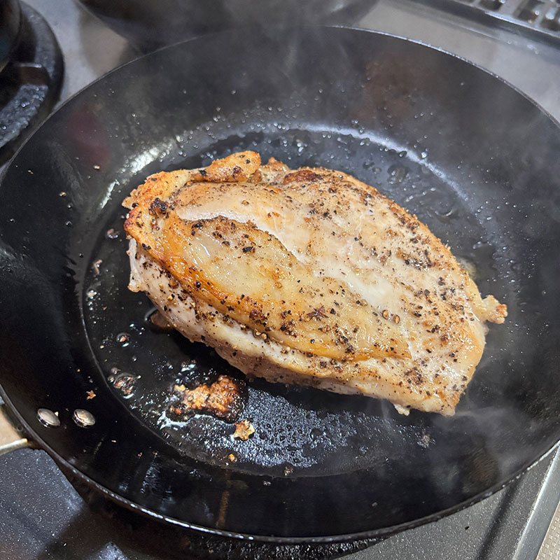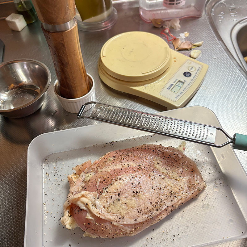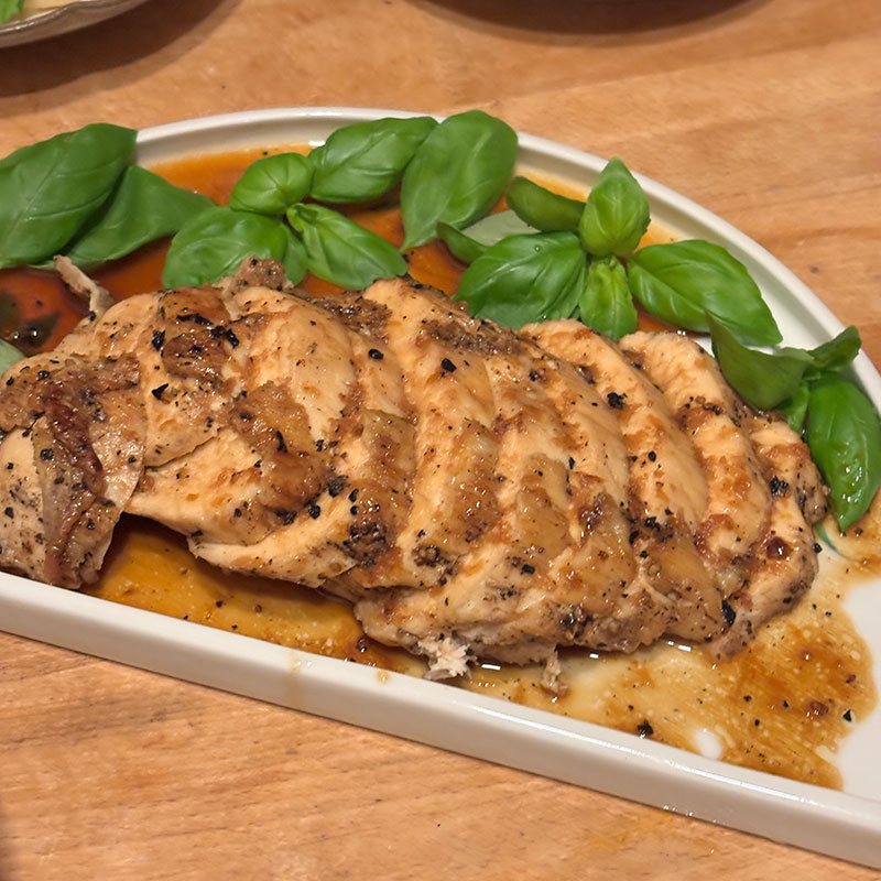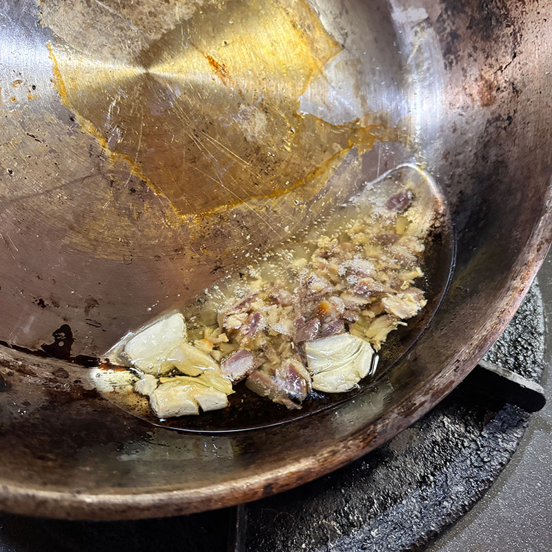 チキンは水栽培のホーリーバジルと一緒に食べる。