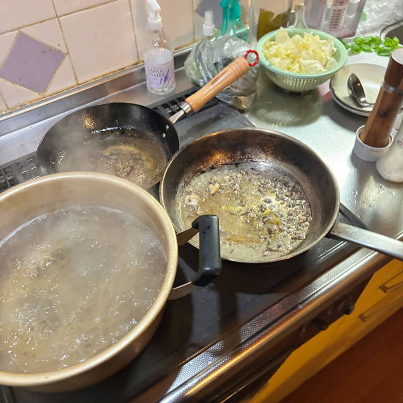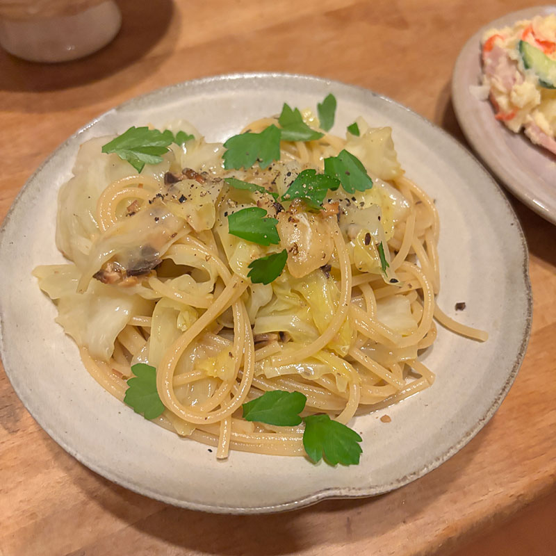 自家製アンチョビとキャベツのパスタ作った。イタリアンパセリ散らして。