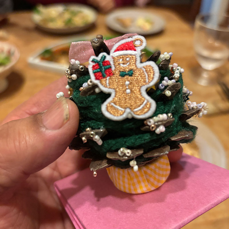 カミさんがリトミックの指導に行ってる保育園の子供達が作った松ぼっくりと緑の毛糸で作られたクリスマスツリーを食卓に飾って。