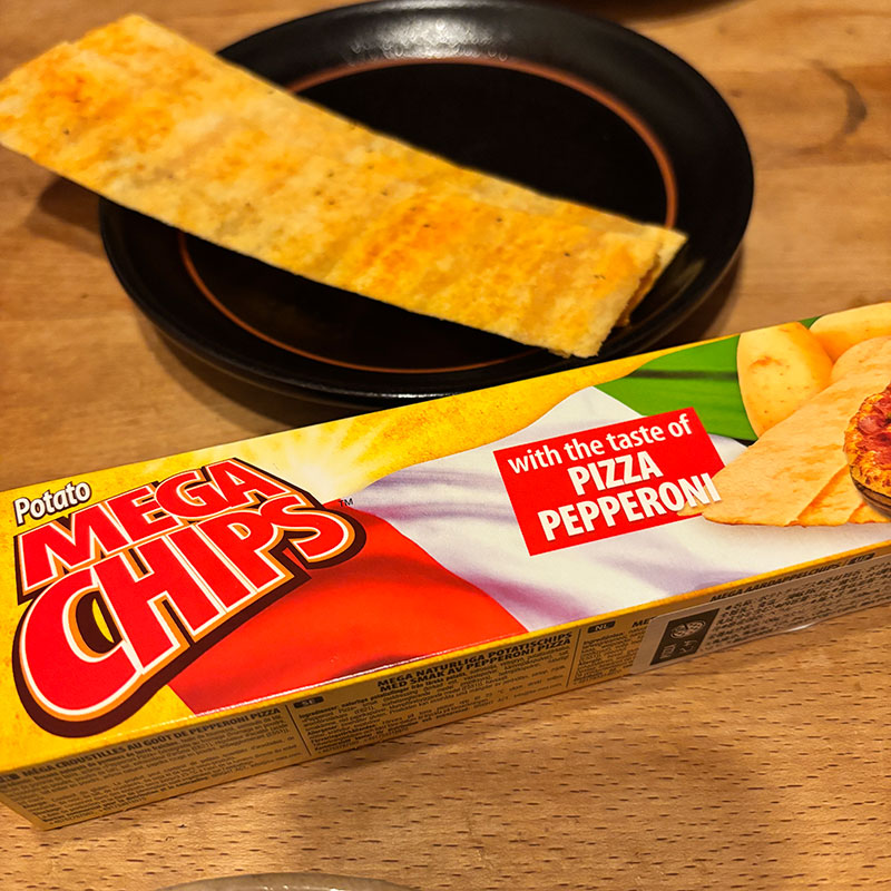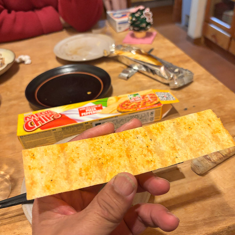 やけにデカくて細長いポテトチップス。パペロニピザ味。