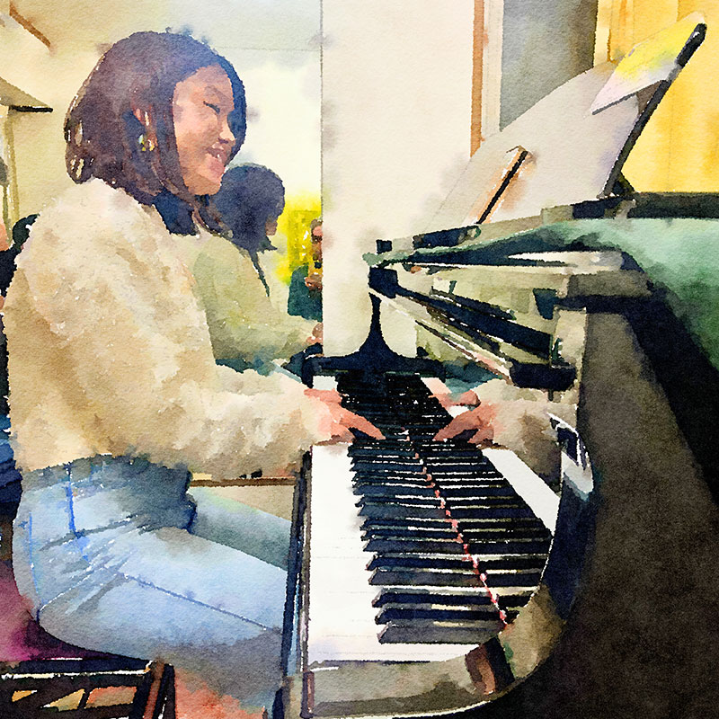 お店の近くの小さな貸しスタジオにみんなで集って。スイミングスクールもピアノも妹に抜かれてやめた・笑