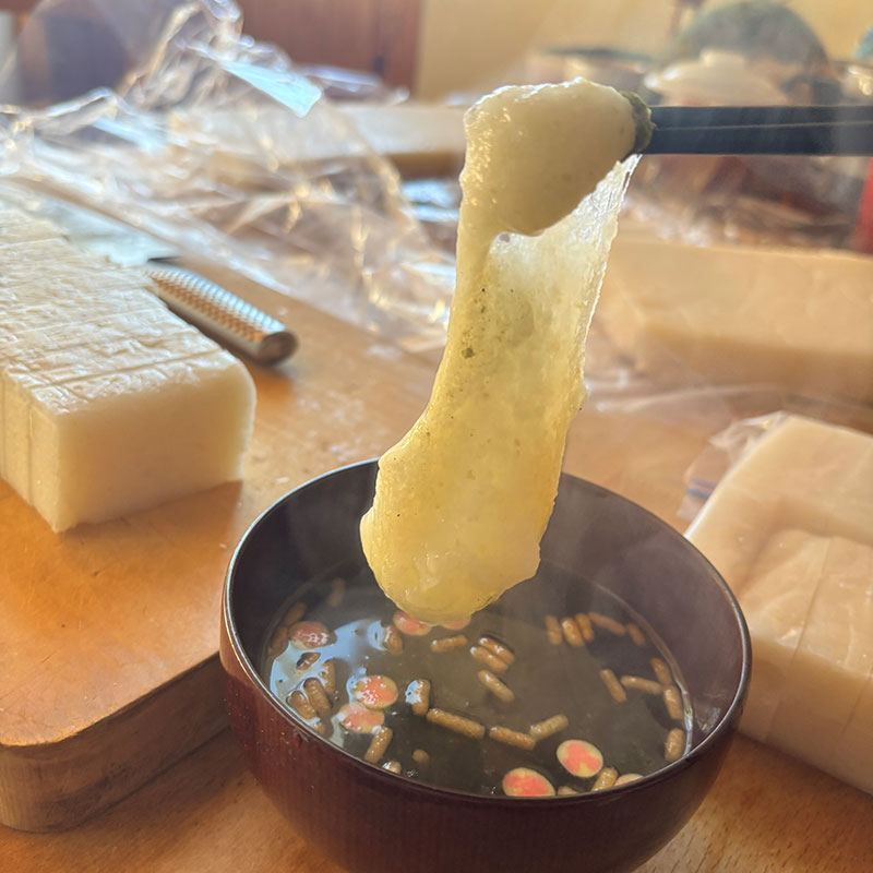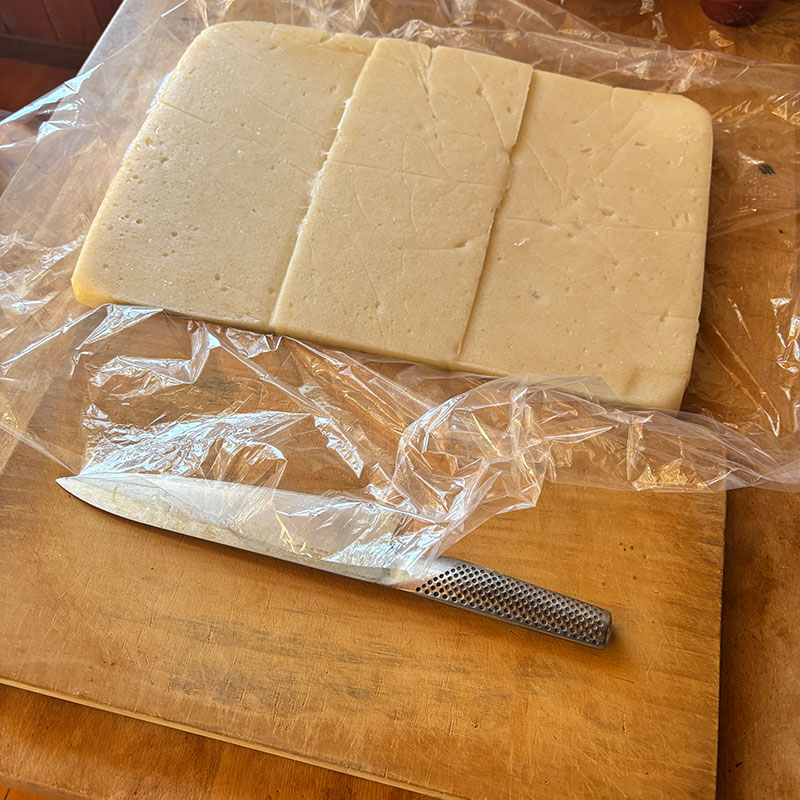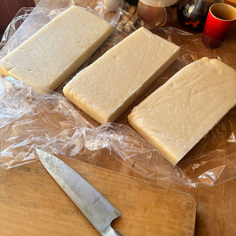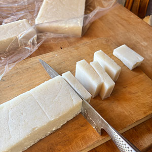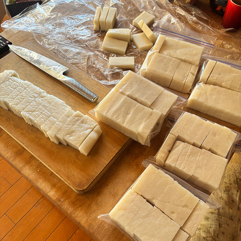 昨日、杵と臼でついた餅。のし餅をいただいた。
