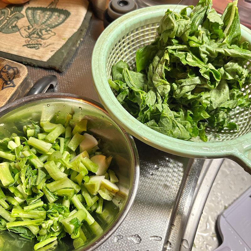 実もだけど葉が美味しいので無農薬で育ててる。まだ小さいけど一本抜いた。葉を茎と柔らかい葉に分けて