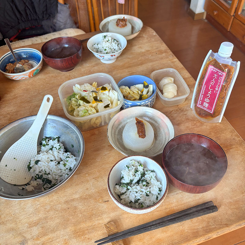 カブのぬか漬けも甘い。大根菜飯と八丁味噌の大根の味噌汁。昼に食べてるのほとんど白菜と大根だ・笑
