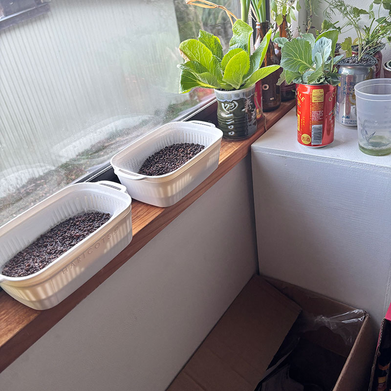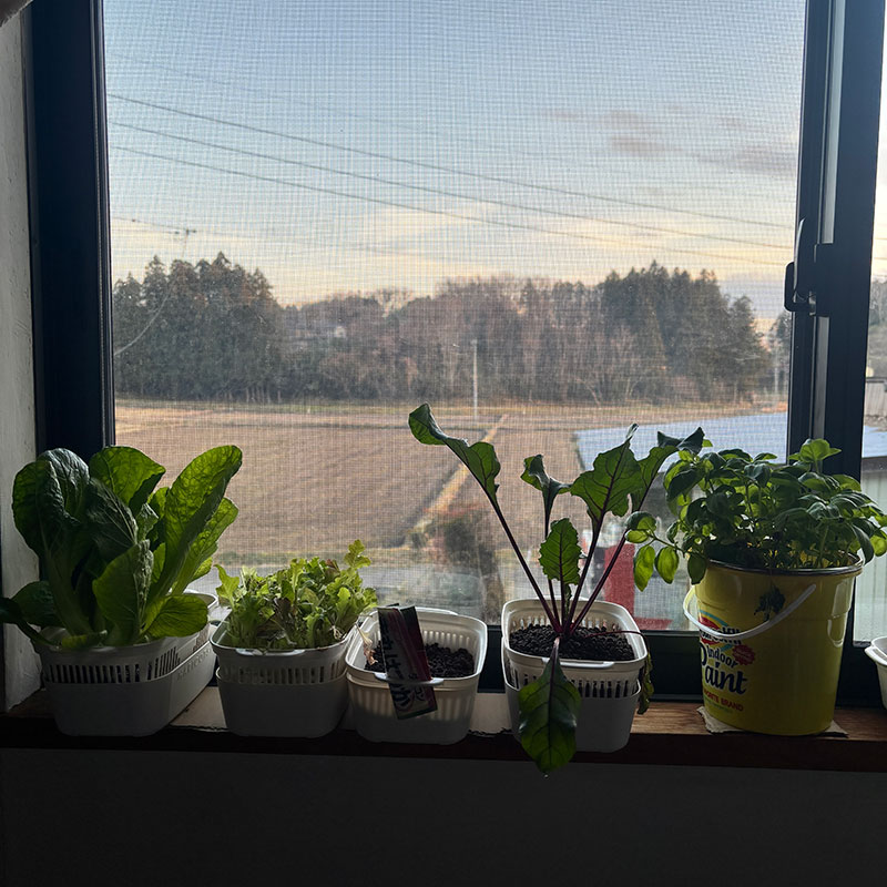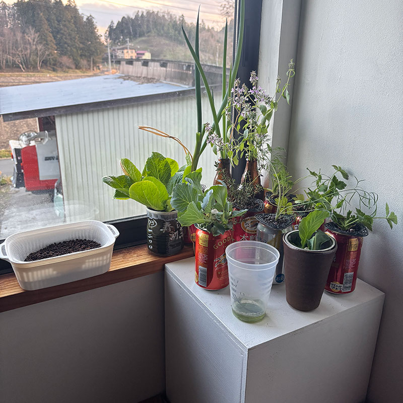 窓際の水栽培コーナーの野菜やハーブがよく育って手狭になってきたので作品の展示台持ってきた。