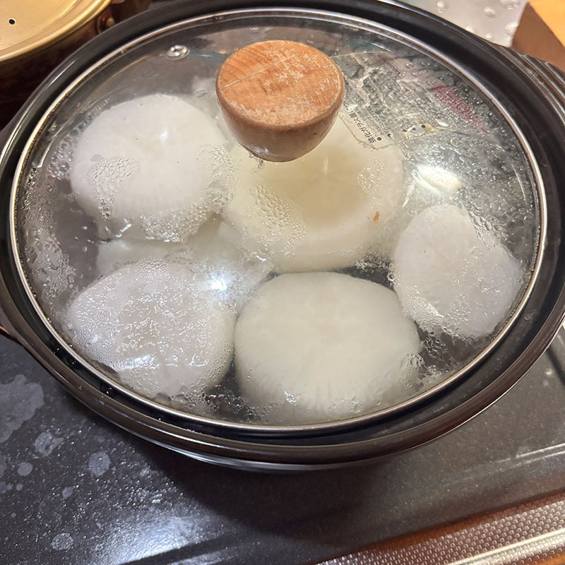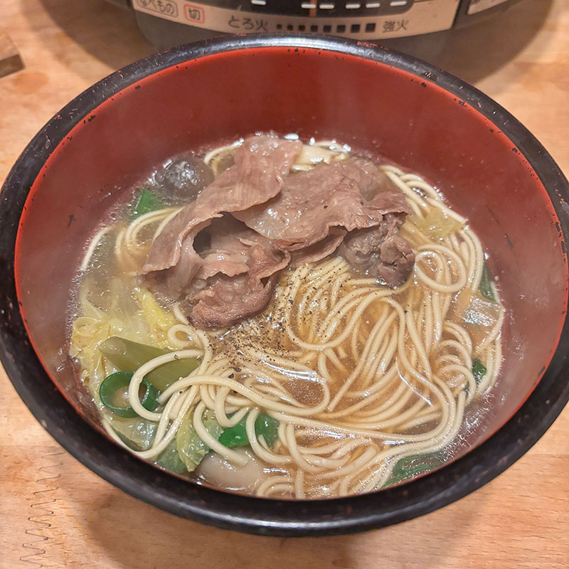 仙台牛ラーメン 今朝、天使の梯子が空にいくつもかかってた。 昨晩の仙台牛の鍋の残り汁でラーメン。醤油麹、オイスターソース、ごま油で味付け。麺は偏愛してるマルタイの棒ラーメン。 長ネギ鍋に全部使って切らしてたので水栽培コーナーのネギで。 仙台牛も一枚残ってたのでトッピングして贅沢な仙台牛ラーメン。滅茶苦茶美味しい。 仙台牛や野菜から美味しい出汁出てるんだろうけど醤油麹の旨味、半端ないな。 大根たくさんいただいたので 昆布で炊いておく。 一晩 魔法の鍋帽子で火を入れる。 2025年12月22日 | コメントはまだありません | カテゴリー: 三日坊主日記