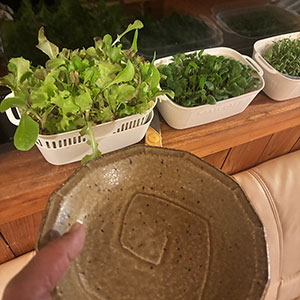 窓際で水栽培してる三つ葉を散らして。