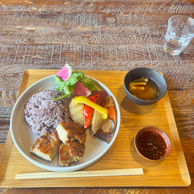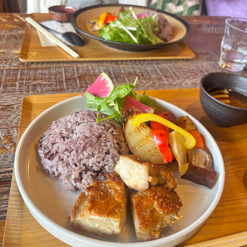 鶏のグリルが皮パリパリ、実はジューシーで最高。古代米も美味しい。