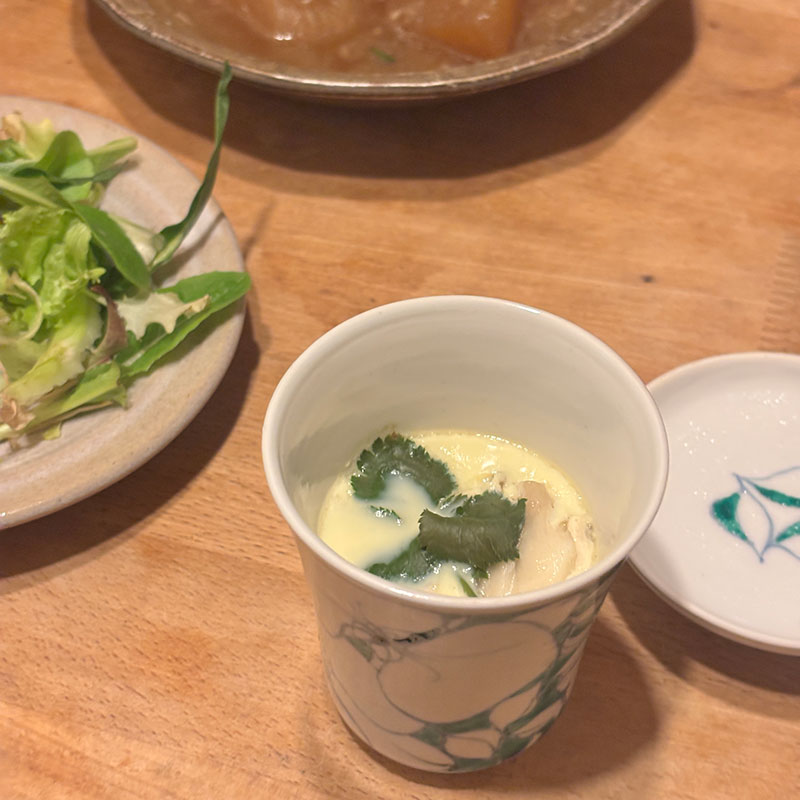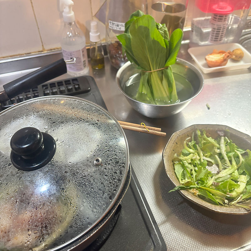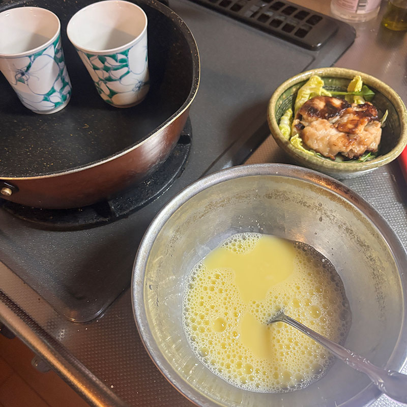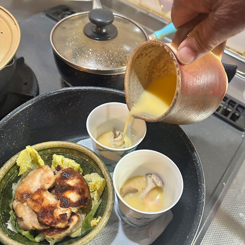 フライパンで昨日残った鶏胸肉のソテーを蒸す。一緒に茶碗蒸しも作る。