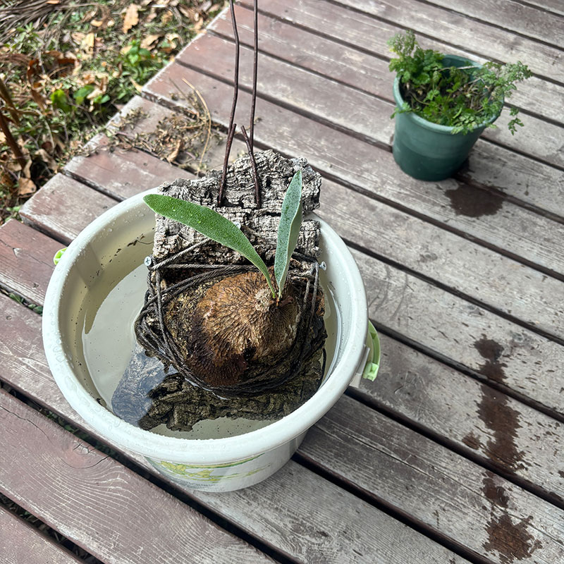 板付きコウモリランが少し元気になってきた。水をやって外気に当てる。