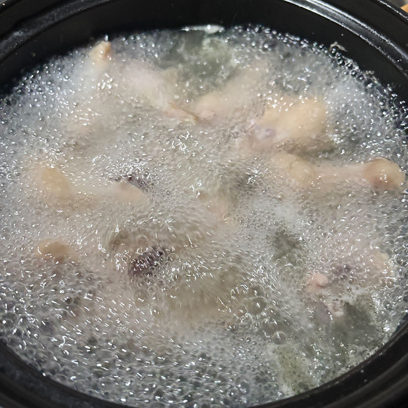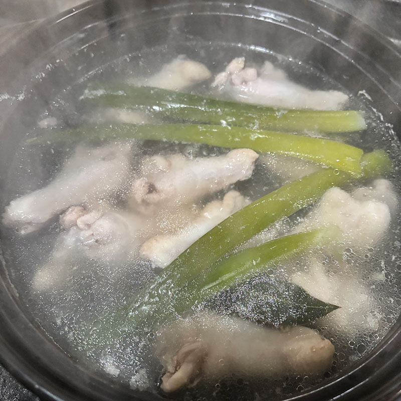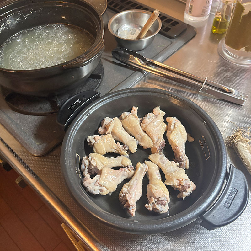1時間炊いた。最後は強火で沸かして鶏白湯ぽくやや白濁した煮汁をベースに