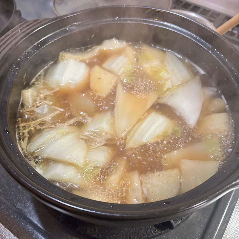 太い長ネギがあったので焦がして風味付け。長ネギ、えのき茸、こんにゃく、大根、夕方いただいた白菜。