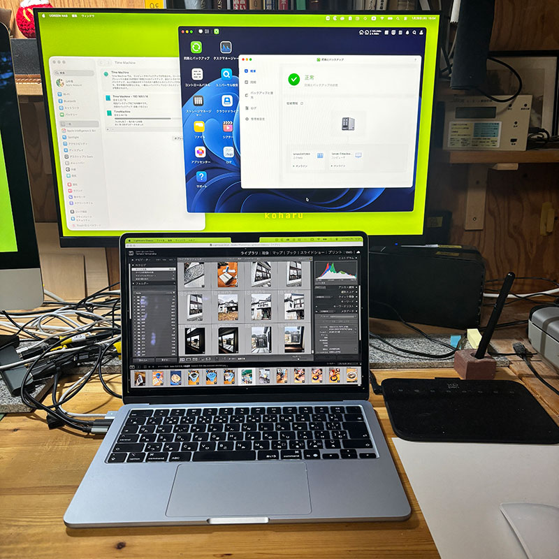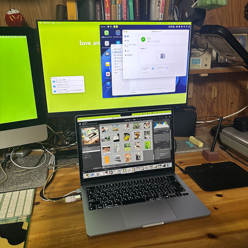 これが本当にひどい。OSのバージョンが上がると最初に立ち上げた時写真ライブラリのアップデートが始まる。これが終わらないとアプリを開けないのだけど1TBもあるのでそれだけで3日もかかる。しかも前にiMacの時はUSB-Aで接続していたのだけどMacBookAirはUSB-Cがふたつだけ。5つの外付けハードディスクを接続するだけでも大変。