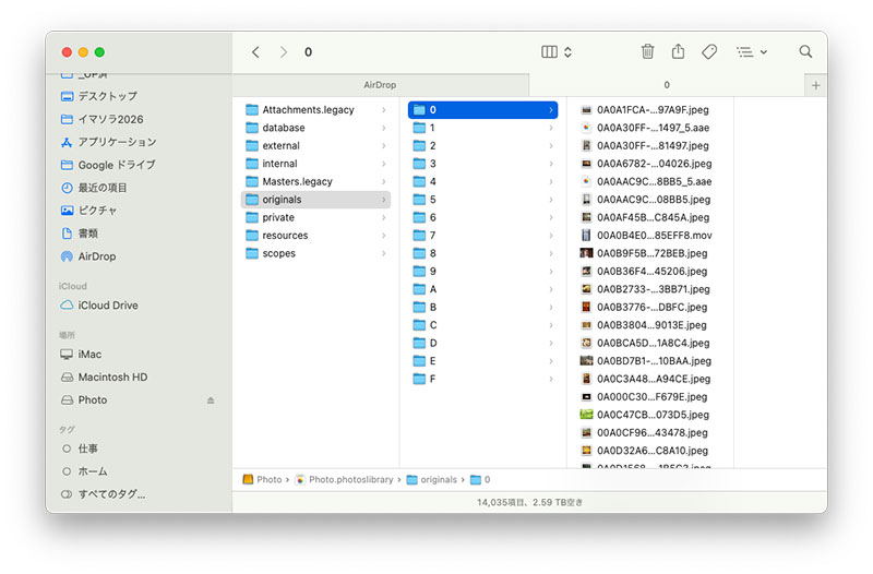 さらに内容を表示したoriginalというフォルダにオリジナルの写真と動画が入っているのだけど写真アプリの前のiPhotoやApertureでは年別月別日別フォルダに入っていたのが写真アプリではランダムなフォルダにランダムに写真が入れられている。ちなみに僕のは0〜9とA〜Fのフォルダ。