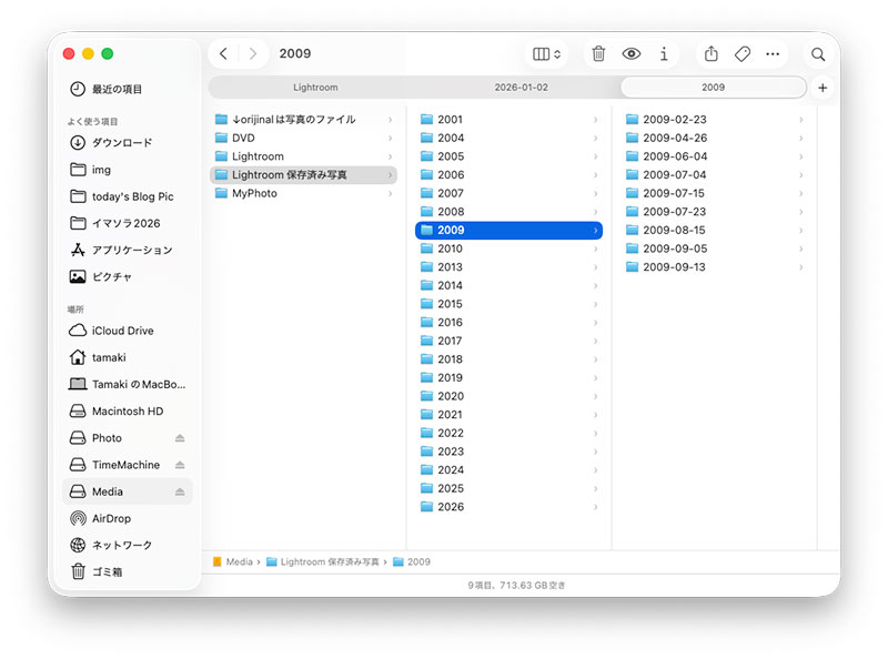 それで写真アプリが立ち上がらなくなり今度はライブラリの修復。そしてやっと開いた。前のiMacを買った時もこれが一番のネックだったので写真アプリで全ての写真と動画を管理するのをやめるのが今回の一番のテーマだった。写真のオリジナルは”Photo.photoslibrary”の中にあるのだけどこれがフォルダではなくパッケージになっていてコンテキストメニューから「パッケージの内容を表示」しないと中が見られない。アプリなどで中の写真をバックアップしようとしてもそのアプリから見るとフォルダに見えないのでそれもできない。いちいち面倒なアプリだ。
