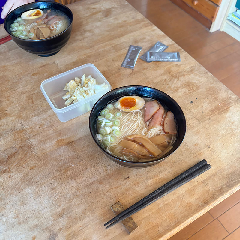 焼豚、メンマ、味付き煮卵買ってきて長ネギとトッピング。