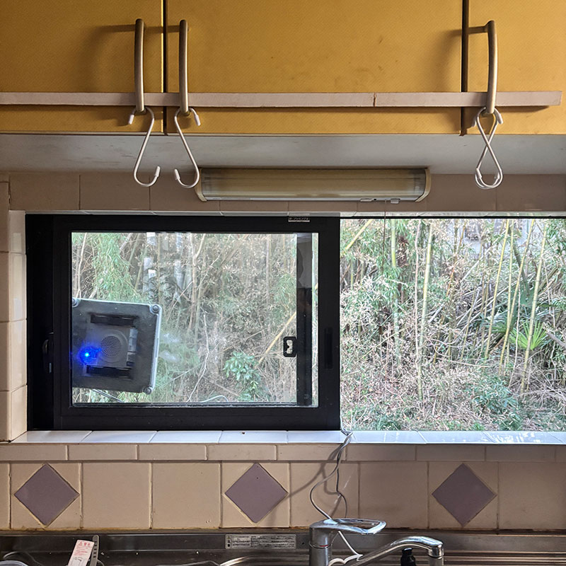 台所の窓。換気扇が排出した油が風で戻ってものすごく汚れるけど2階で長い梯子で高いところで作業しなくちゃでガラス掃除大変だった。