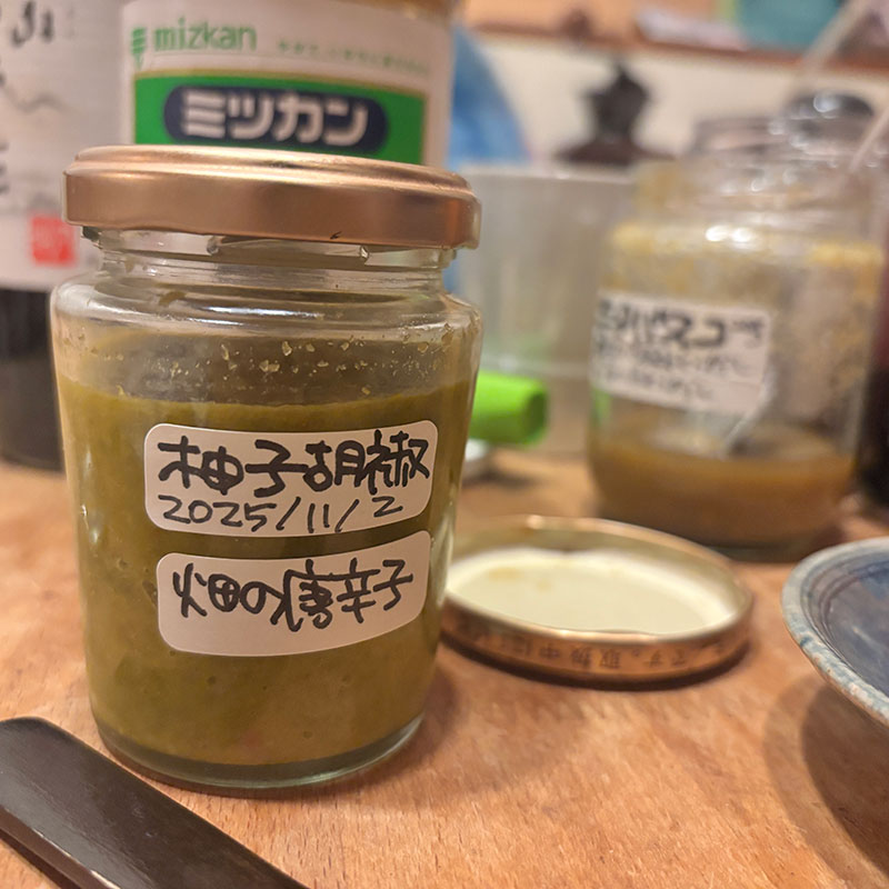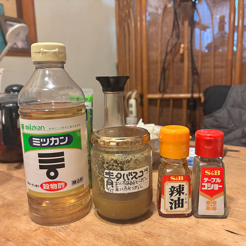 黒酢にラー油や酢に胡椒の定番はもちろん畑の青唐辛子で作った自家製のタバスコと米酢で食べるのも美味いんだ。