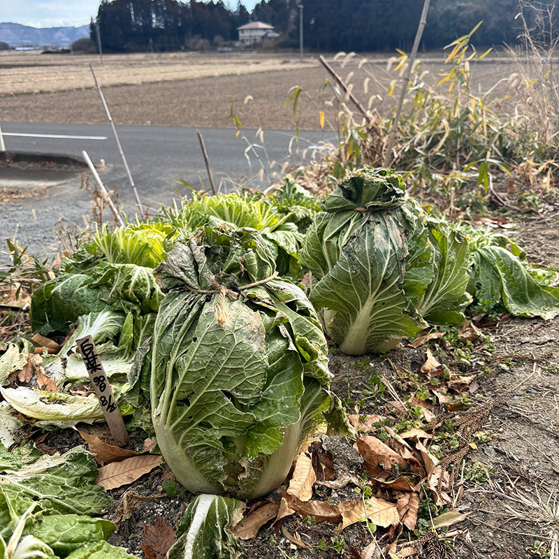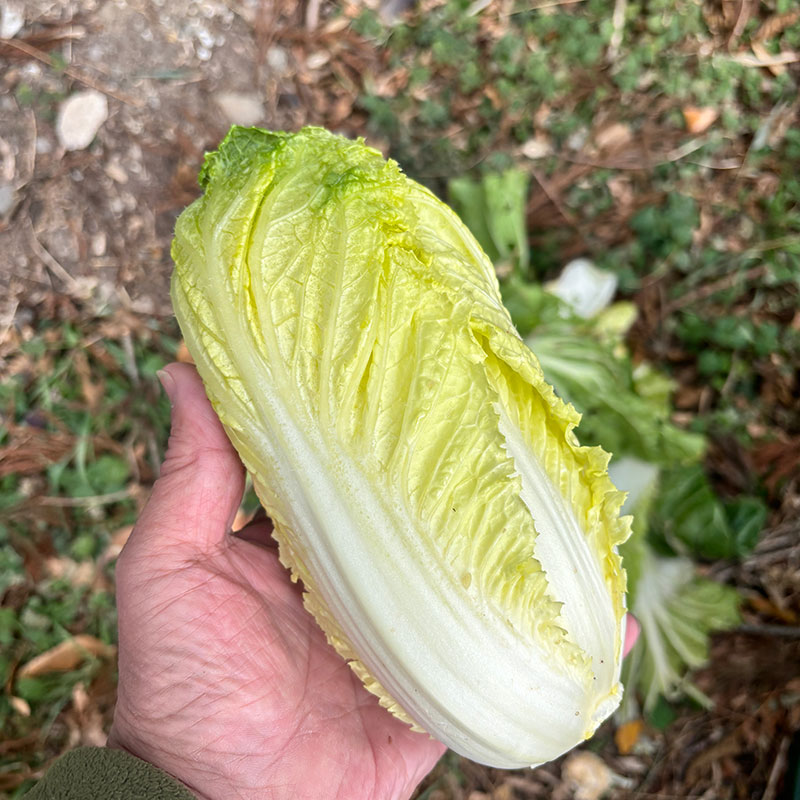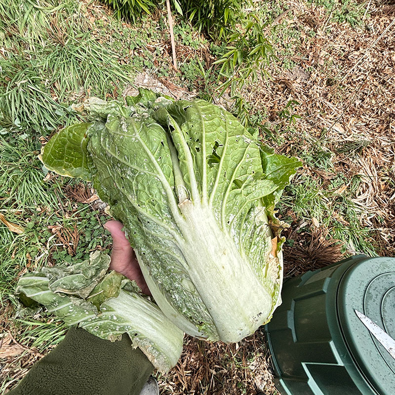 今宵はキムチ鍋にしようというので畑の外葉を縛ってあった白菜収穫しておく。
