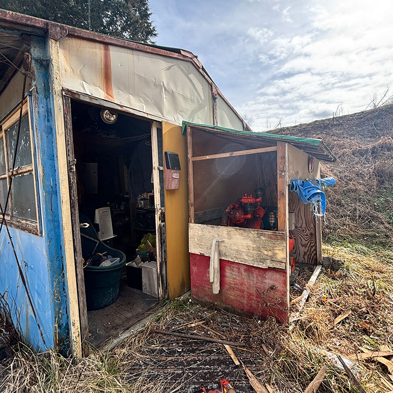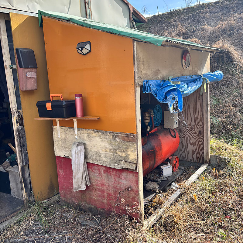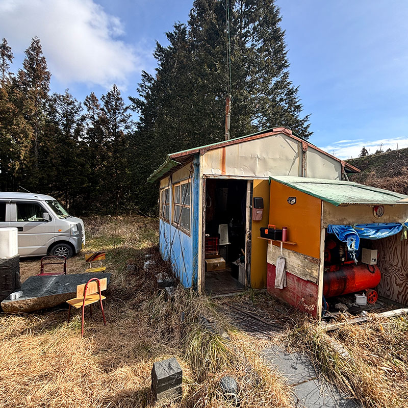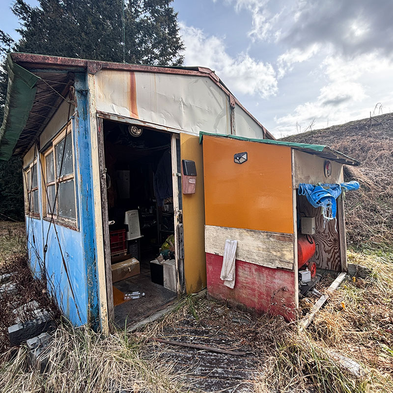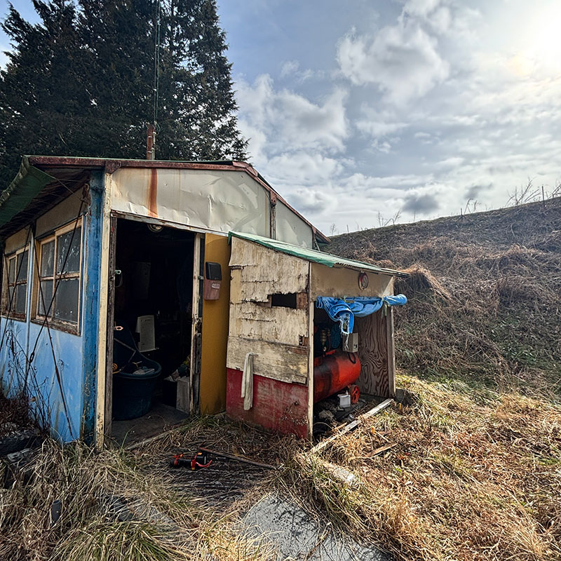 仕事場のコンプレッサー小屋の壁が長年の風雪にさらされてボロボロ。