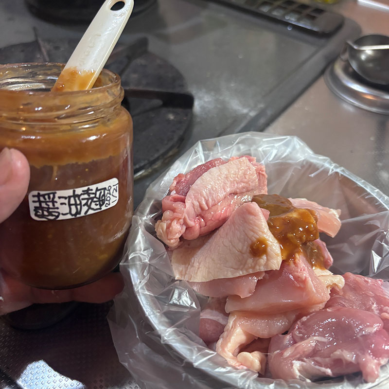 鶏もも肉は少しの醤油麹に30分くらい浸けた。