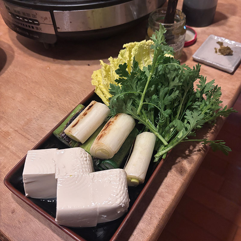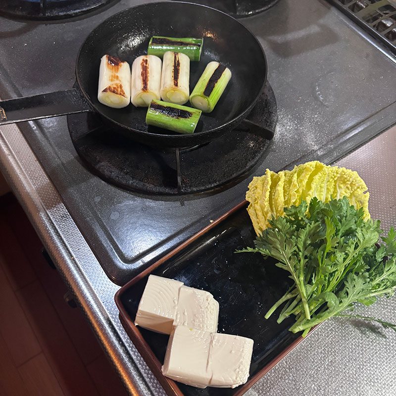 産直広場あぐりっとで買った太い長ネギは焼いて香ばしくしてから鍋へ。