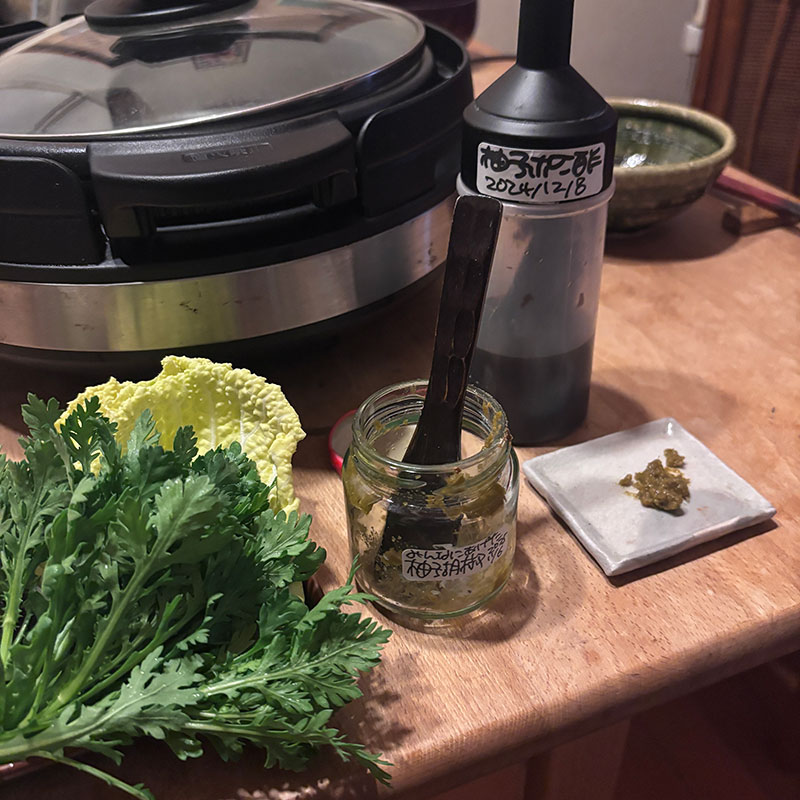 水栽培の春菊も直前に収穫して投入。