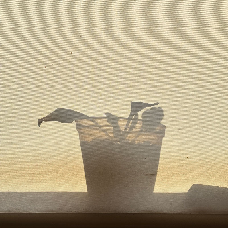 スクリーンカーテンに窓際で育ててる水栽培の野菜の影が映ってる。