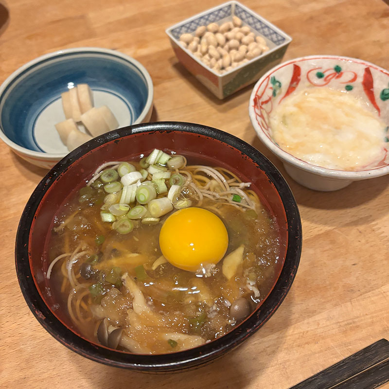 月見そばの夕食、昆布と鰹節でていねいに出汁をとって昆布水に大根おろしもすり入れたツユで。節分の豆、美味しいw