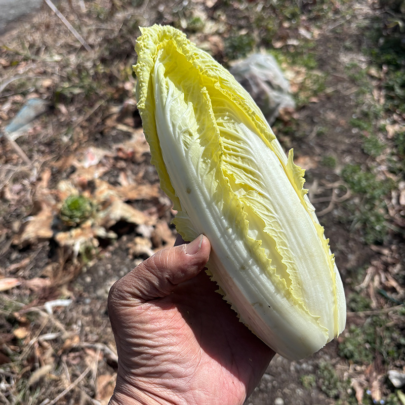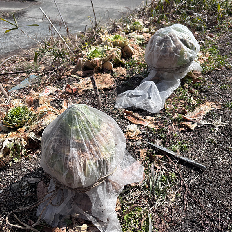 残り2つになった畑の白菜収穫。ムクドリが食べまくるので不織布で覆っていた。