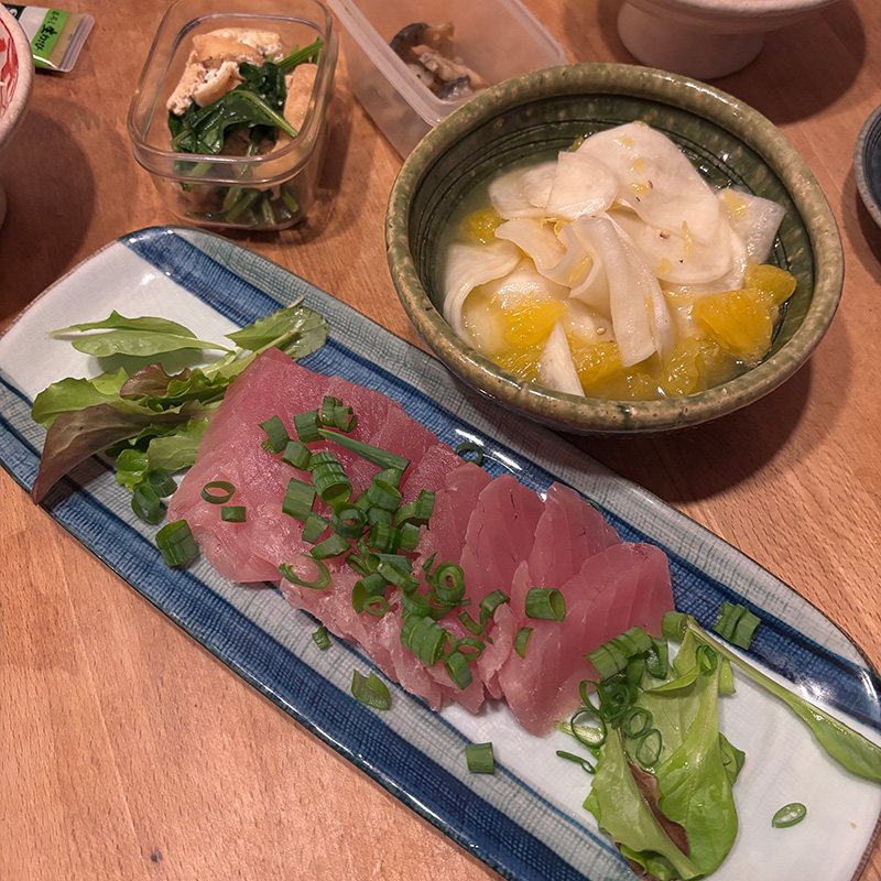 鮪の刺身には水栽培のサラダ菜と