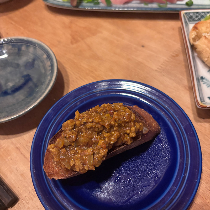 それを元に作ったスパイスカレーをバゲットに乗せて。
